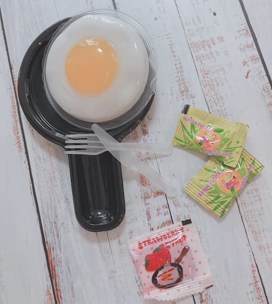 目玉焼きの形をしたゼリーといちご味のソースにパチパチキャンディがセットになっています。