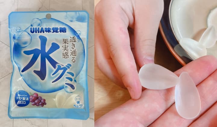 「水グミ」透明だけどブドウ味がして、スーッとほのかな清涼感もある不思議なグミでした。