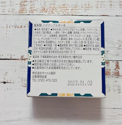 原材料名:パイナップルジャム(砂糖、パイナップル、水あめ)(国内製造)、小麦粉、バター、砂糖、液卵黄、ドライパイナップル、ドライマンゴー、加糖練乳、脱脂粉乳、ナチュラルチーズ、食塩/ソルビトール、ゲル化剤(ペクチン)、酸味料、香料、セルロース、乳化剤、リン酸Ca、保存料(亜硫酸Na)、カロチン色素、(一部に小麦・卵・乳成分・りんごを含む)