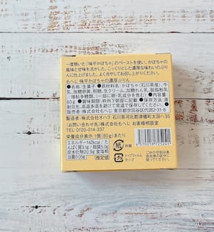 原材料名:かぼちゃ(石川県産)、牛乳、加糖卵黄、粗糖、生クリーム、加糖れん乳、脱脂粉乳/増粘多糖類、(一部に卵・乳成分を含む)