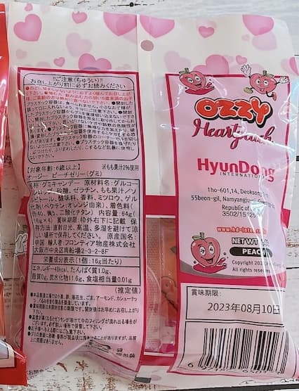 原材料名:グルコースシロップ、砂糖、ゼラチン、もも果汁/ソルビトール、酸味料、香料、ミツロウ、ゲル化剤(ペクチン:オレンジ由来)、着色料(赤40、黄5、二酸化チタン)