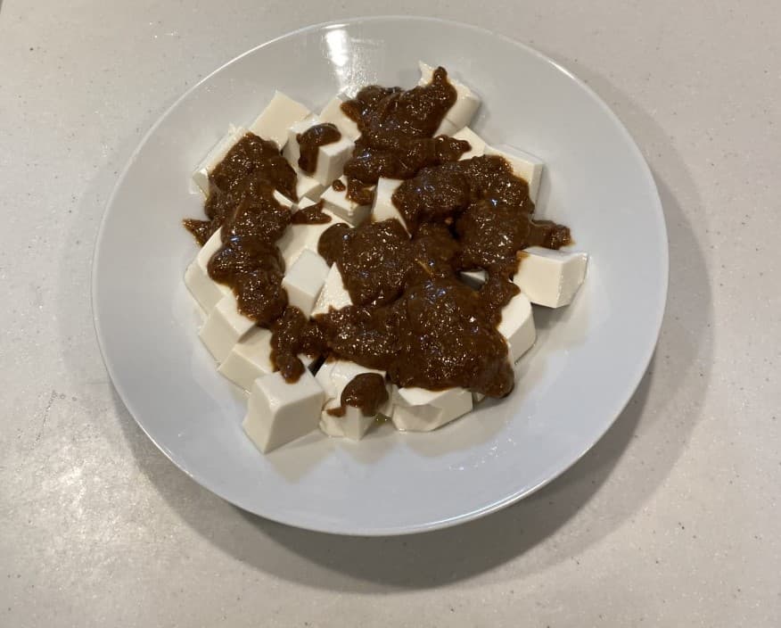 フライパンでひき肉(玉ねぎ、ねぎのみじん切り、青梗菜など野菜があったらより良さそう)を炒めて、ソースと豆腐をそこに合わせたらよりおいしくなりそうだなと思いました。