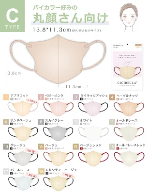 マスクと紐のカラーの色番が「丸顔さん向け」と「面長さん向け」で一部異なっています。