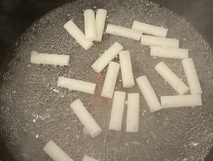 まずはフライパンに水を入れ沸騰させ、トッポギを2分ほど茹でます。