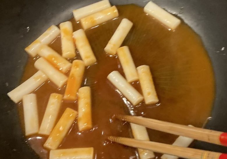トッポギをフライパンに戻して、ソース1袋と水20㏄を入れます。