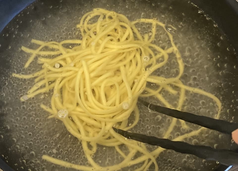 1人分なので袋の半量(100g)を沸騰したたっぷりの湯に投入、ほぐします。