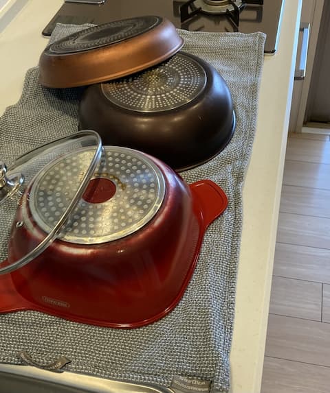 使い方は簡単で、ティータオルを二つ折りにして洗った食器や鍋を置くだけ。