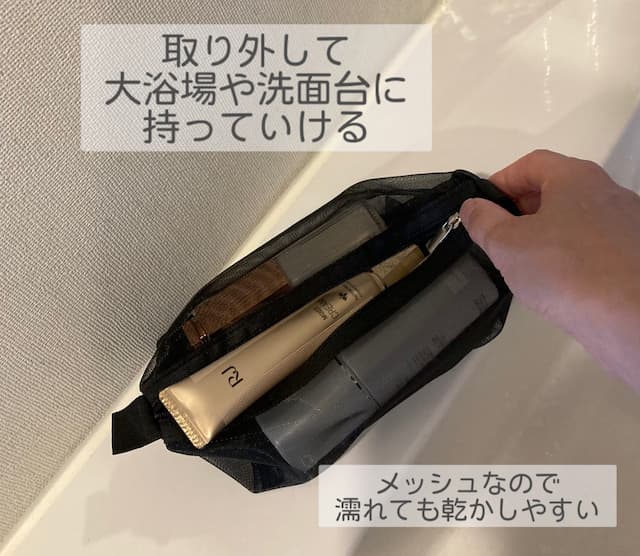 メッシュのポーチが取り外せるし小分け簡単、大容量。吊り下げもできますよ。