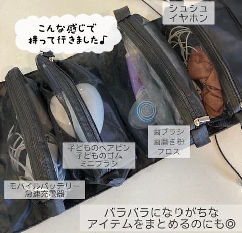 メイク用品を入れようかなとも思ったのですが、今回は旅行バッグや旅先の部屋でバラバラになりがちな小物をまとめる用として使いました。