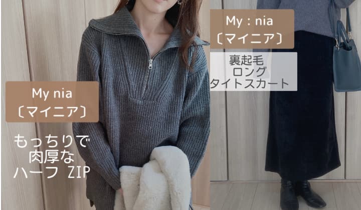 マイニアさんのこのハーフジップニットの商品ページに、この上下のコーデの上から黒のジャケットを羽織った写真があるのですが、短めアウターと合わせた時にニットがチラ見えしてすごくかわいいです。