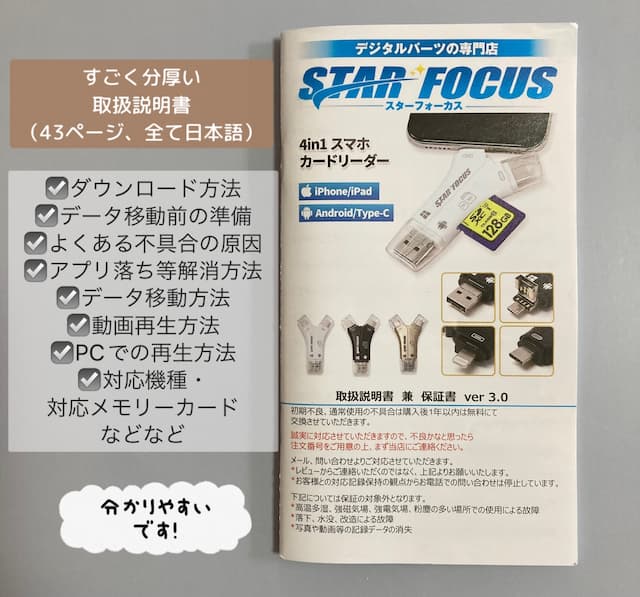この4in1スマホカードリーダー、取扱説明書がすごく分厚い!
