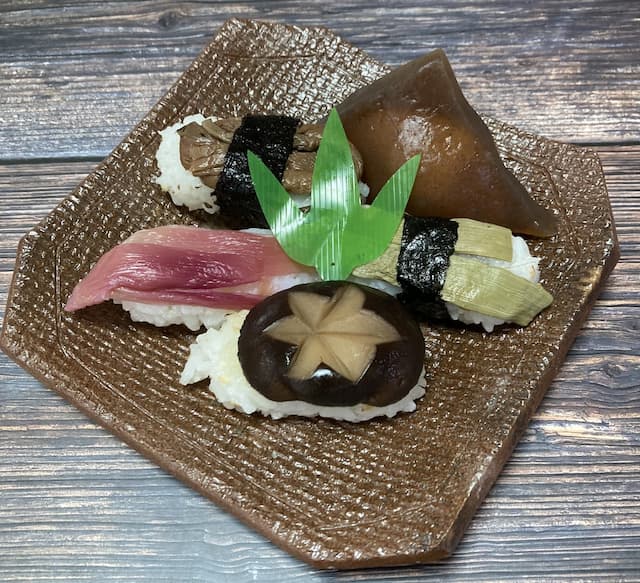 魚以外の食材(山菜、こんにゃく、しいたけなど)を使った見たこともないお寿司がたくさん!