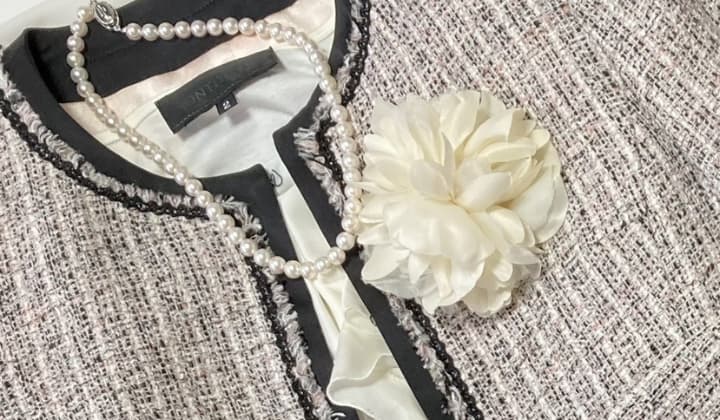 ツイードジャケット、パールのネックレスと白のコサージュ
