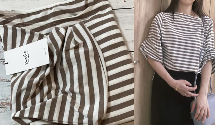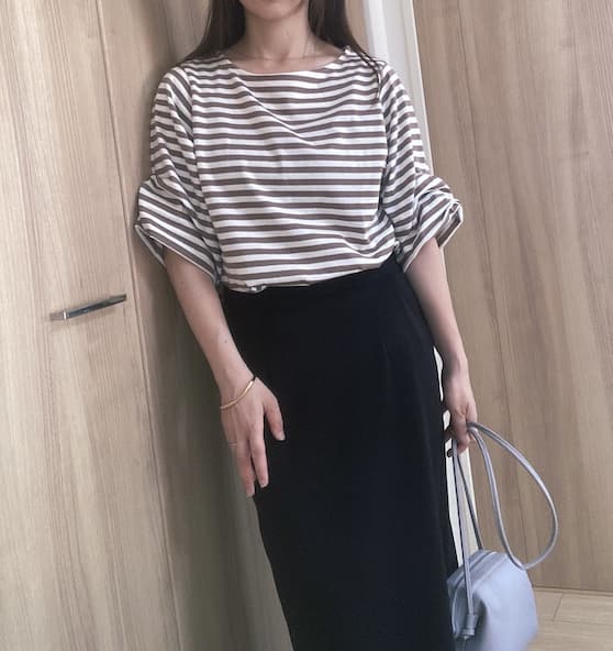 ボーダーの柔らかいカラーが黒いボトムスにピッタリかなと感じました♪
