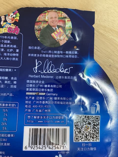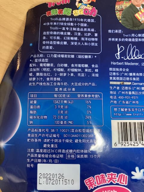 「Trolli」はドイツ第三位の大手グミメーカーMEDERER(メダラー)社のブランドですが、ちゃんと記載がありますね。